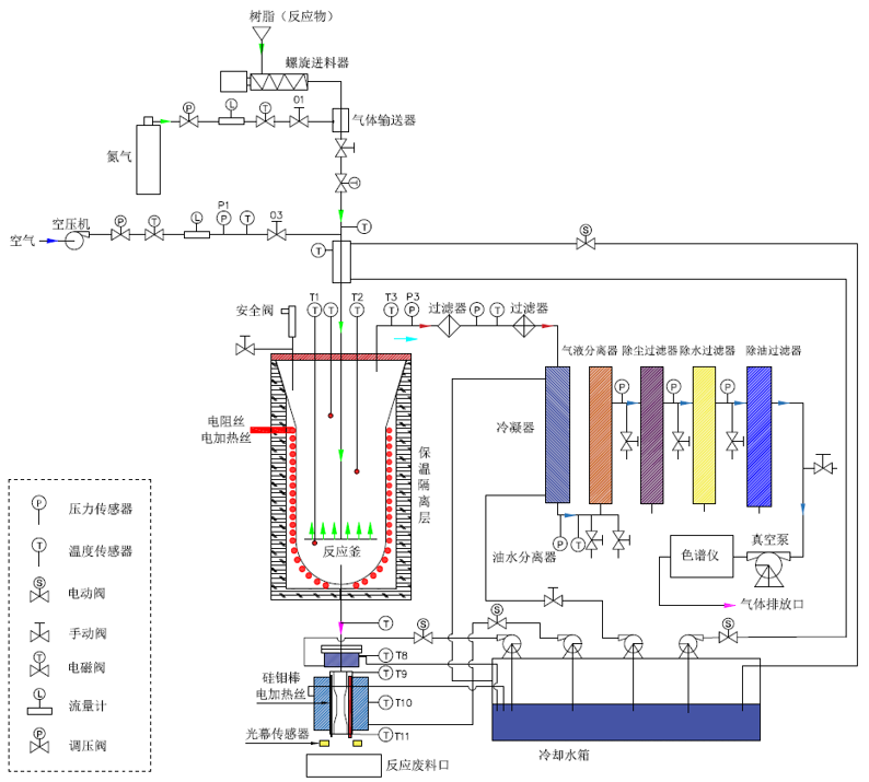 本装置是专为树脂在高温熔盐中反应研发的技术试验性装备,核心实现“反应物-气体进料精准控制→高温熔盐反应过程调控→产物出料稳定控制→尾气高效处理”的全流程试验功能。通过模块化设计与智能控制系统协同,为树脂熔盐反应工艺的参数优化、机理研究提供可控的试验环境,系统不包含尾气分析模块,专注于反应过程的核心试验支撑,适配高校实验室、化工研发中心及企业中试场景的需求。