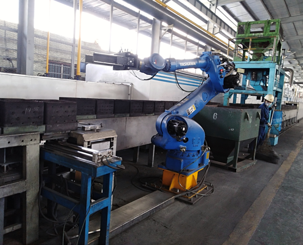 卸料机械人是专为高温、高粉尘环境设计的坩埚成品物料翻转卸料专用装备,核心适配冶金、材料等行业的生产线卸料场景。设备可自动完成产线流转坩埚的横移/顶升、抓取、翻转卸料全流程:先将坩埚从产线移出,再由机械手精准抓取并移送至卸料位,最终通过翻转动作完成物料卸载,彻底替代人工在恶劣环境下作业,大幅提升卸料效率与安全性。